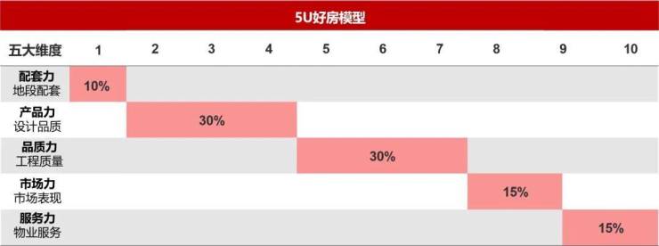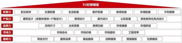 “5U”代表着五个维度,包含配套力/地段配套、产品力/设计品质、品质力/工程质量、市场力/市场表现、服务力/物业服务。配套力强调项目周边设施完善度、交通便利度等;产品力注重建筑、景观、室内、工区等设计综合能力;品质力则关注空间尺寸、主体质量、使用功能等方面;市场力聚焦项目的市场去化、市场盈利等方面;服务力则是对项目交付、服务品质等进行综合考量。