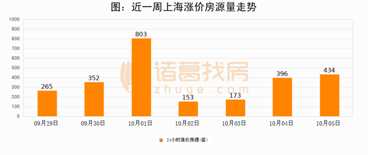 根据诸葛找房数据显示,上海24小时涨价房源量为434套,较10月04日增加38套,环比上涨9.6%。与此同时,涨价房源占比小幅扩大,业主信心有所提升。