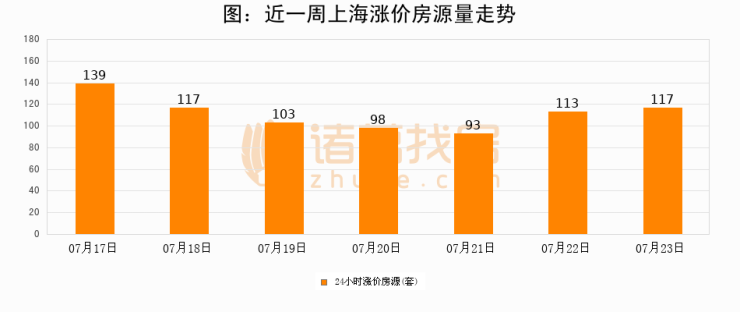 根据诸葛找房数据显示,上海24小时涨价房源量为117套,较07月22日增加4套,环比上涨3.5%。与此同时,涨价房源占比小幅扩大,业主信心有所提升。