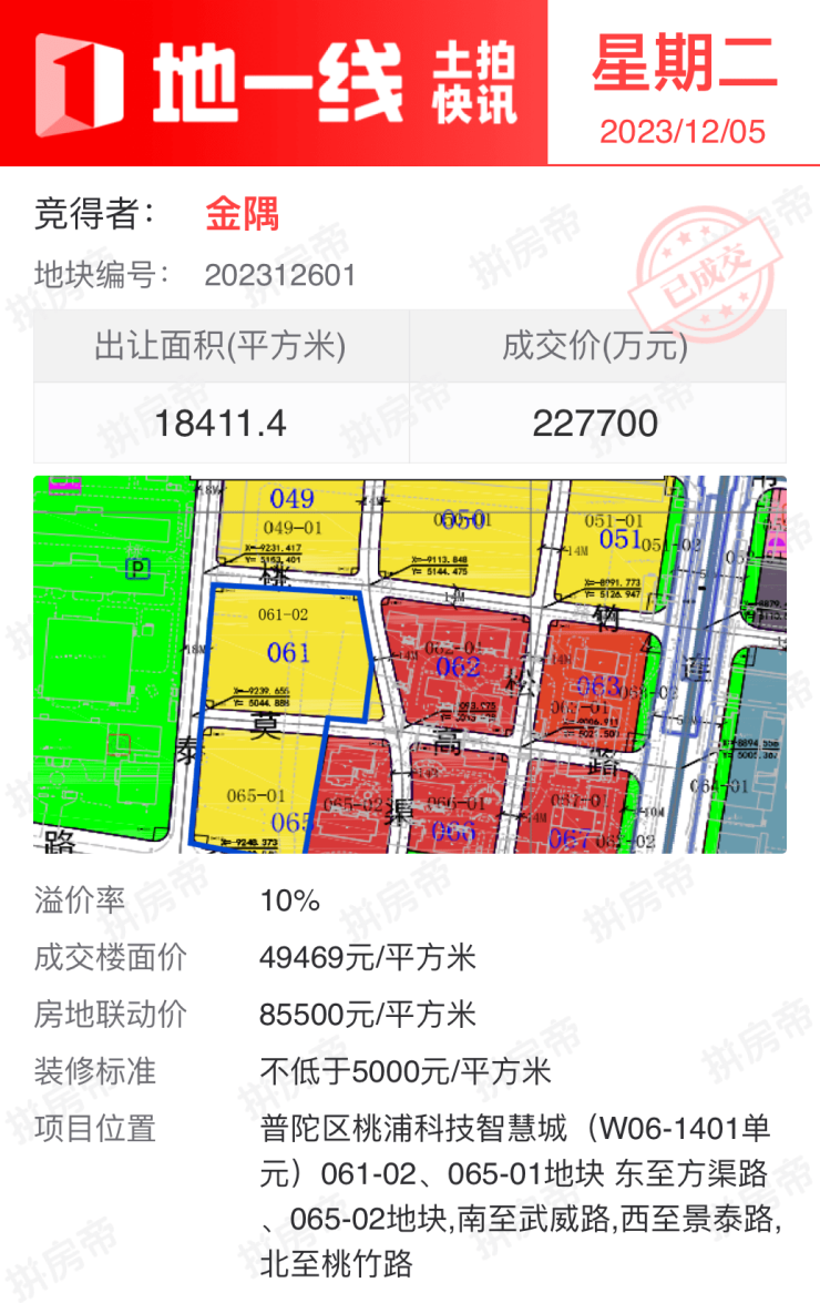 金隅以227700万元拿下普陀桃浦纯宅地,成交楼板价49469元/㎡,房地联动价85500元/㎡,装修标准不低于5000元/㎡。