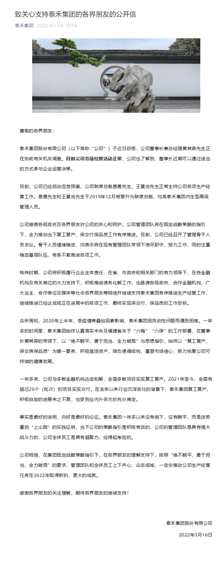 随后,泰禾集团通过官方微信号发布《致关心支持泰禾集团的各界朋友的公开信》,文章称,目前公司各项经营活动正常,董事长近期可以通过适当的方式参与企业运营决策。