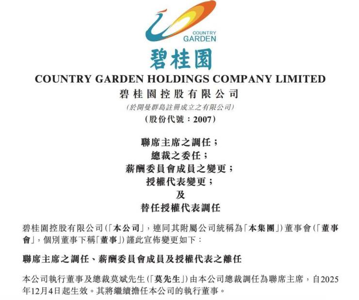 12月4日晚,碧桂园集团连发两则公告,涉及重要人事调整与债务重组进展。