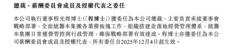 原执行董事兼总裁莫斌调任为联席主席,继续担任执行董事;原执行董事、常务副总裁程光煜升任集团总裁。所有委任自2025年12月4日起生效。