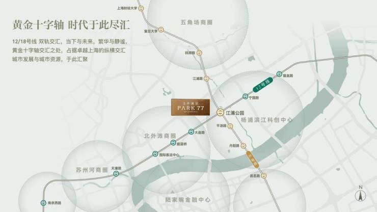 双轨交汇(12号线与18号线江浦公园站)的优势,使项目成为无缝连接城市核心资源的枢纽。30分钟内可通达陆家嘴、北外滩、徐家汇等关键板块。