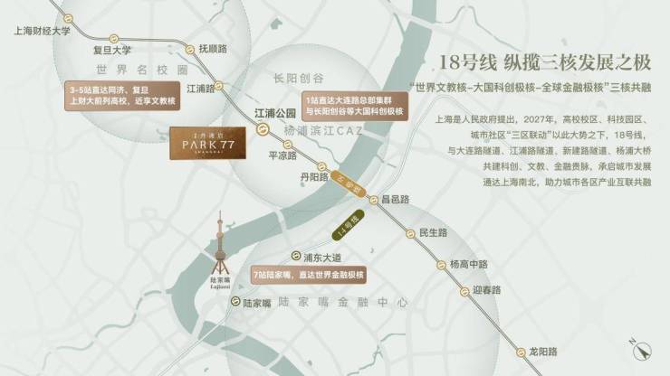 纵向的18号线则贯通“世界文教核-大国科创极核-全球金融极核”,文教极核链接同济、财大等顶尖高校,外滩启3-5站直达三大高校,近享文教核。一公里内15所学校荟萃,菁英教育资源密集,为区域提供高知生活氛围和持续的人才动力。