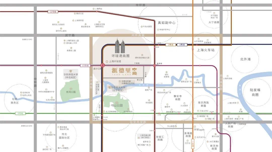 同时,中海汇德里项目与苏州河的直线距离约100米,在家即可欣赏到苏州河景。在商业方面,项目紧邻48万㎡的上海较大的单体购物中心——月星环球港,周边还有中山公园龙之梦、来福士广场等大型商业综合体,商业配套非常发达。