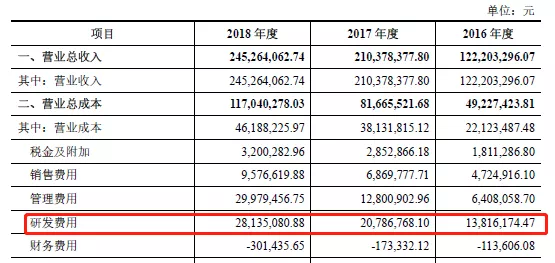招股说明书显示,2016年—2018年,柏楚电子的研发费用分别为 1381.62 万元、2078.68 万元、2813.51 万元,占当期营业收入的比重分别为11.31%、9.88% 、11.47%。