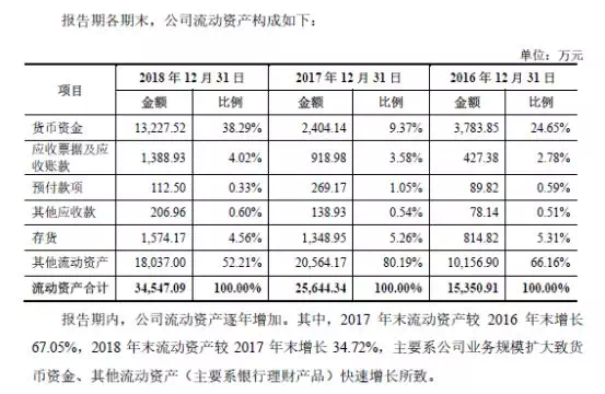 具体来看,招股说明书显示,与2016年末相比,2017年末的流动资产同比增长67.05%;与2017年末相比,2018年末的流动资产同比增长34.72%。