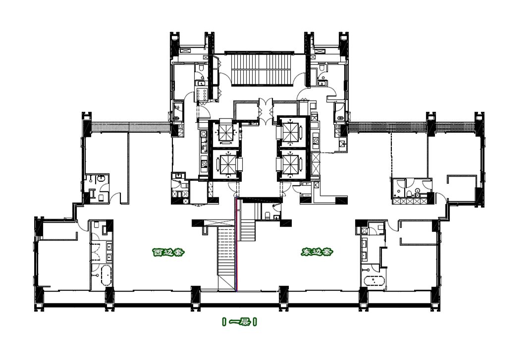 注:室内部分墙柱可敲除,装修自由设计,图中红线位置为东边套与西边套分界线。