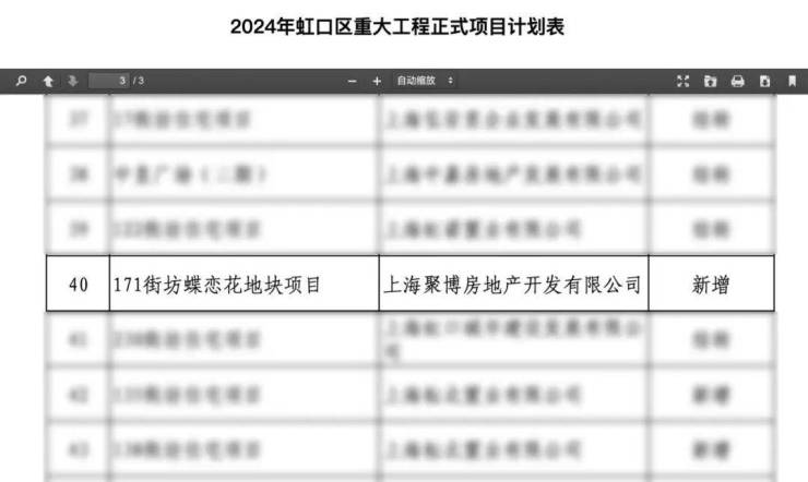 就在3月初,虹口区建设管理委员会正式发布了《2024年虹口区重大工程正式项目计划表》。其中,上海聚博房地产开发有限公司开发的171街坊蝶恋花地块项目赫然在列。