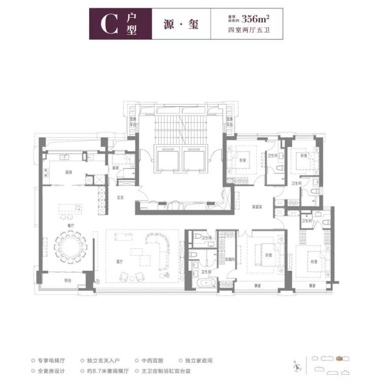 C户型建面约356㎡大平层户型做成4房2厅5卫,专享独立电梯厅,设有入户玄关、中西双厨、独立保姆房,约8.7米大横厅,四间卧室全套房设计均带独立卫浴,主卧定制浴缸双台盆。