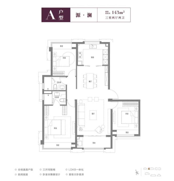 其中,A户型建面约143㎡3房2厅2卫,全明采光,三开间朝南,厨房、餐厅、客厅、阳台相连,主卧套房设计,带独立卫浴,三间卧室都带飘窗。