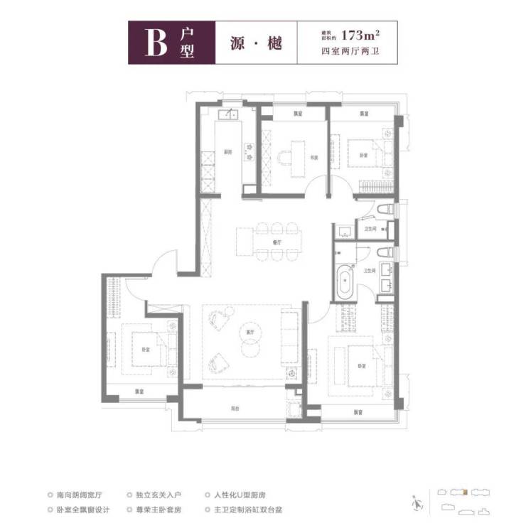 B户型建面约173㎡4房2厅2卫,在A户型基础上多一个书房,四个房间都送飘窗,且户型空间更大,设有独立入户玄关,以餐厅为中心,动线布局合理,另外主卫配置有浴缸。