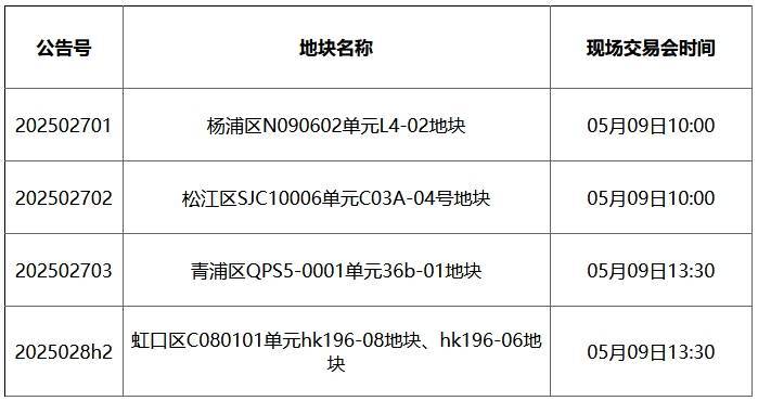 5月7日,上海土地市场官网发布了四批次4幅地块现场交易活动安排的通知,将于5月9日举行现场交易会。