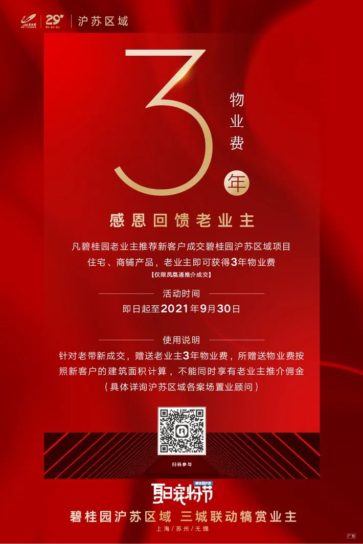 即日起至2021年9月30日,凡碧桂园老业主推荐新客户成交碧桂园沪苏区域项目住宅/商铺产品,老业主即可获得3年物业费(具体详询沪苏区域各案场置业顾问)。(限凤凰通成交;所赠送物业费按新客户的建筑面积计算,不同时享有老业主推介佣金)
