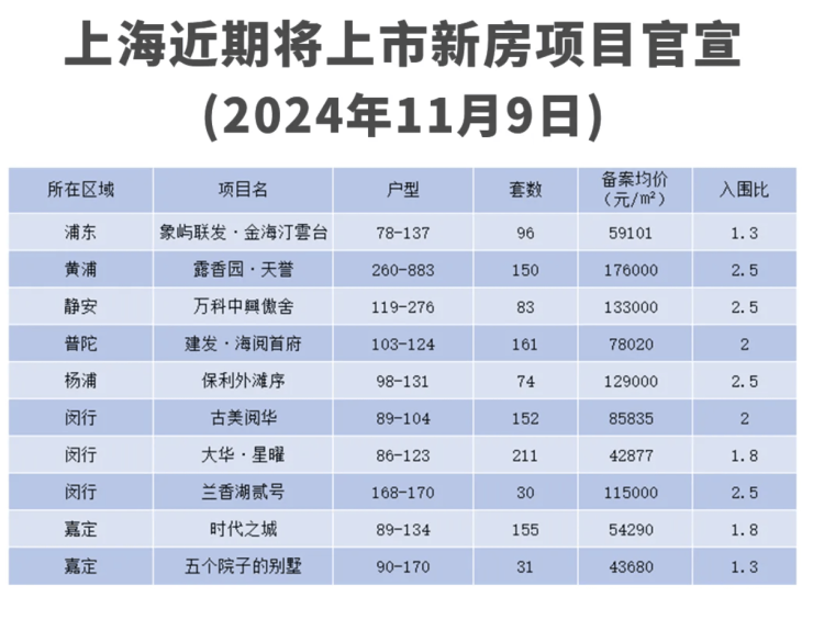 此次名单合计10个项目,分布在浦东、黄浦、静安、普陀、杨浦、闵行、嘉定,将合计推出1143套房源。其中10w+项目共4个:露香园、万科中兴傲舍、保利外滩序以及兰香湖贰号。