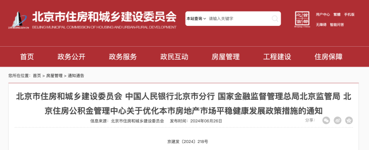 6月26日,北京市住建委、央行北京分行、金融监管总局北京分局、北京公积金中心等部门联合下发通知,出台一系列房地产调控措施。