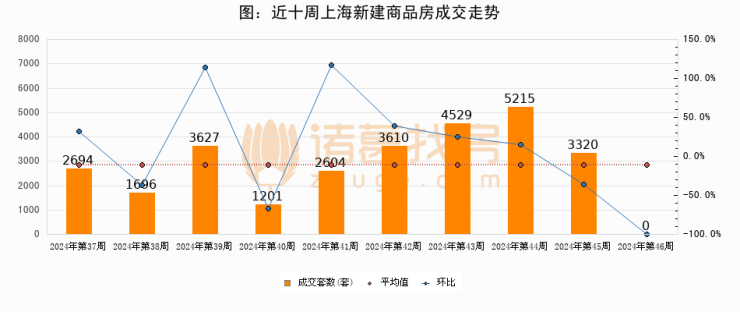 进入2024年第46周(11月11日-11月17日),上海新建商品房成交0套,较上周减少3320套,环比下降100%