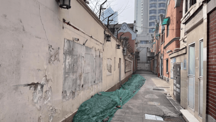 从实地看到,地块内部暂时处于非净地状态,石库门里弄已经封闭,无人居住,原有老旧建筑尚未拆除。据悉,该地块属于南京西路愚园路零星旧改项目,2024年,通过规划调整为二类住宅组团用地。