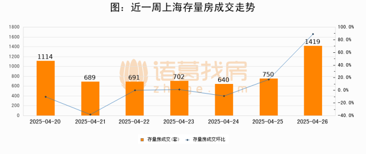 从存量房来看,2025年04月26日上海存量房单日成交1419套,比昨日增加669套,环比上涨89.2%。从近一周存量房成交来看,上海存量房日均成交套数为857套,04月26日单日成交1419套,高于近一周平均水平65.6%。