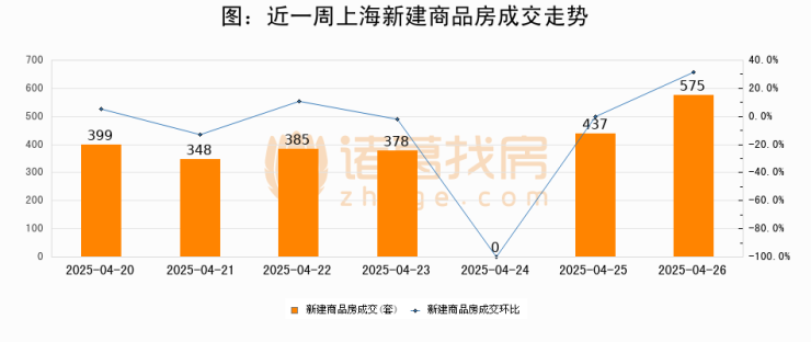 根据上海市房地产交易中心数据显示,2025年04月26日上海新建商品房成交575套,较昨日增加138套,环比上涨31.6%