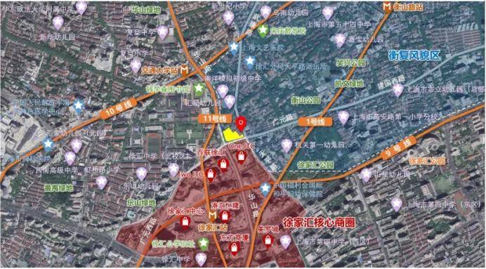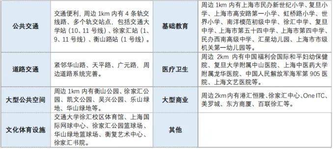 地块交通便利,周边1公里内有4条轨交线路、多个轨交站点,包括交通大学站(10、11号线)、徐家汇站(1、9、11号线)、衡山路站(1号线)。