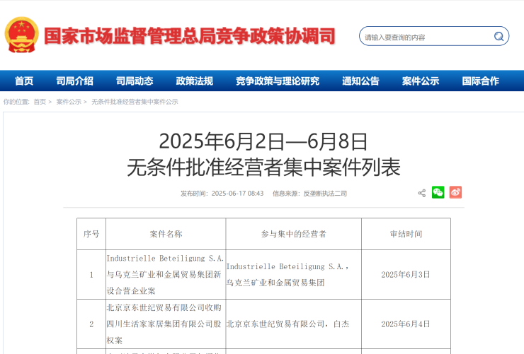6月17日,根据国家市场监管总局公示,2025年6月2日—6月8日共有8件经营者集中案件获无条件批准。其中,北京京东世纪贸易有限公司收购四川生活家家居集团有限公司股权案获无条件批准,审结时间为2025年6月4日。