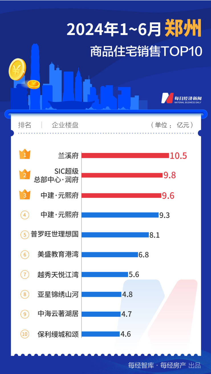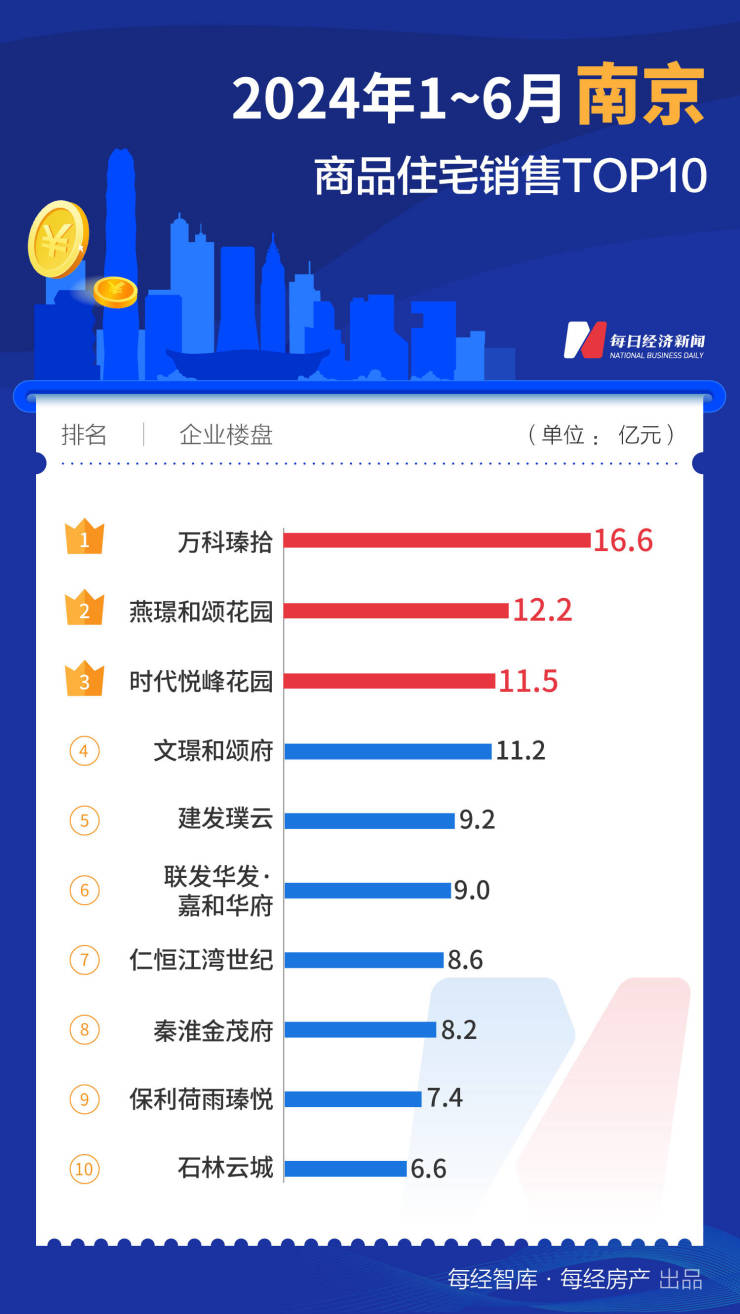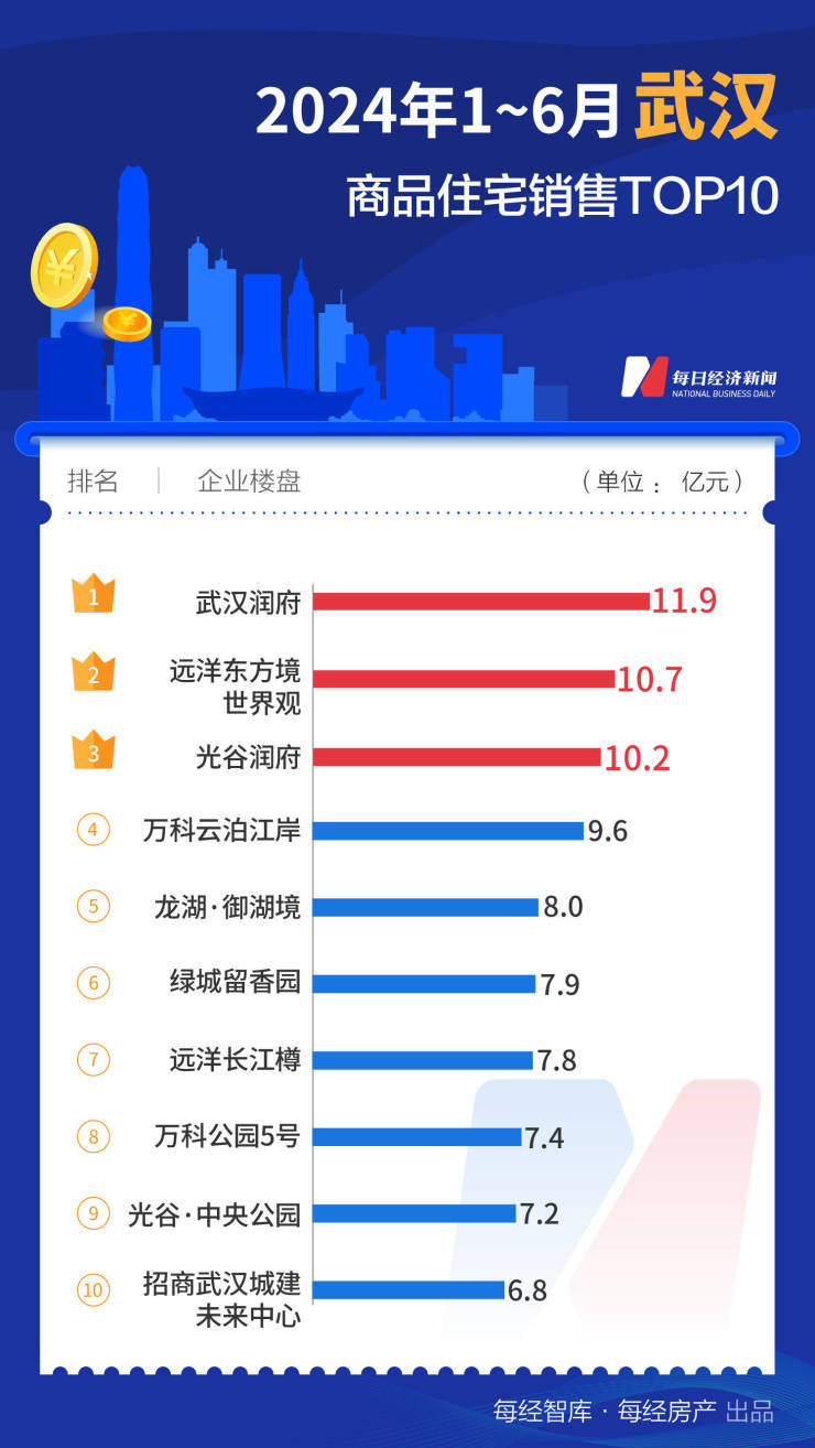 值得注意的是,南京、长沙两个城市TOP10项目合计销售额均在100亿元上下,而武汉、郑州、重庆(中心城区)则不足百亿元。