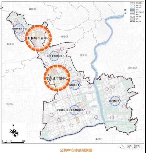 五大地区中心—— 南虹桥、七宝-虹桥、梅陇、元江地区-剑川路两侧和浦江五大地区中心,并进一步形成多个社区中心完善基本公共服务。