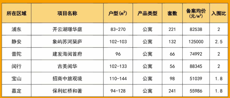 其中,均价最高的象屿苏河琹庐为静安纯新盘,近期刚刚公布项目名字,132套房源一次性推出,备案均价12.5万/平方米,入围比2.5。