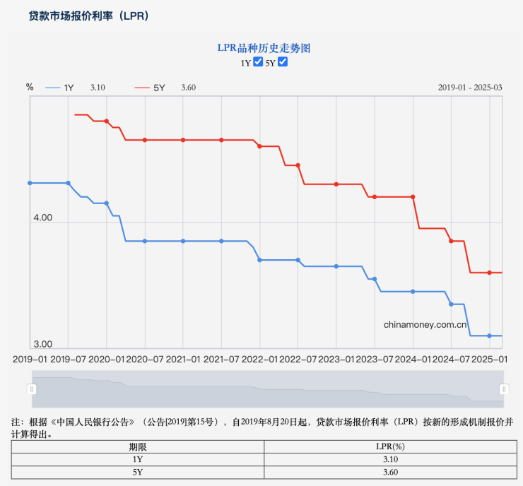 中国人民银行授权全国银行间同业拆借中心公布,2025年3月20日贷款市场报价利率(LPR)为:1年期LPR为3.10%,5年期以上LPR为3.60%,均与前期保持一致。以上LPR在下一次发布LPR之前有效。