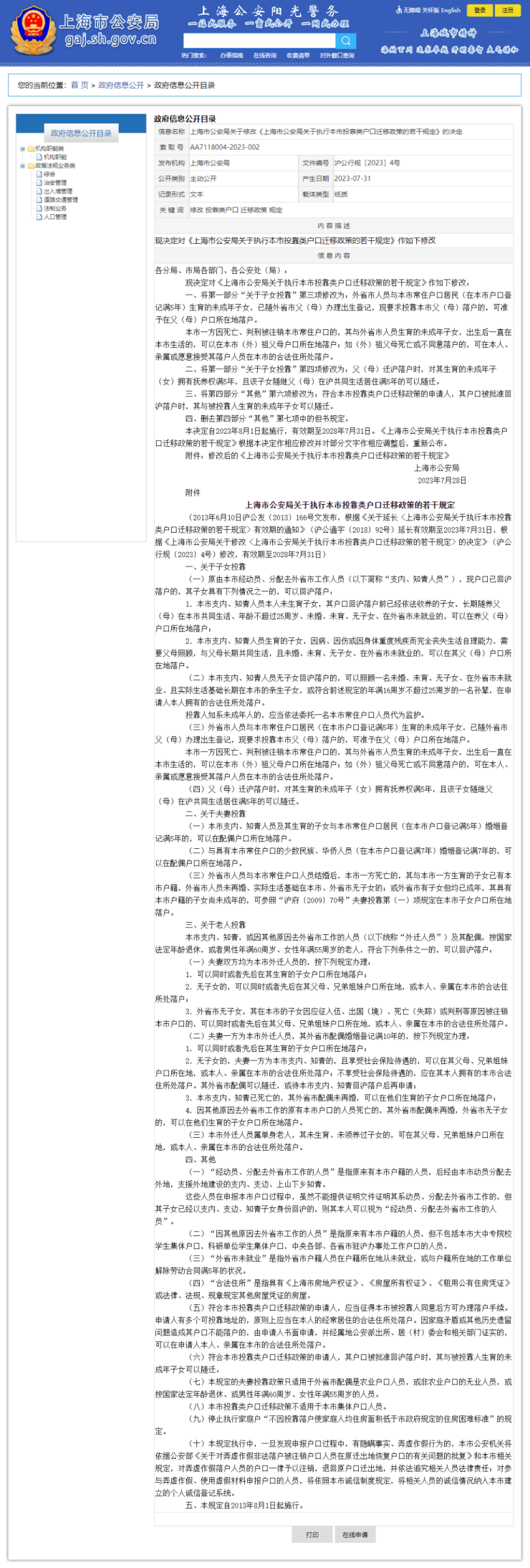 据上海市公安官网信息,《上海市公安局关于执行本市投靠类户口迁移政策的若干规定》作了一些修改,关于夫妻投靠、子女投靠、老人投靠的落户政策延期了五年。