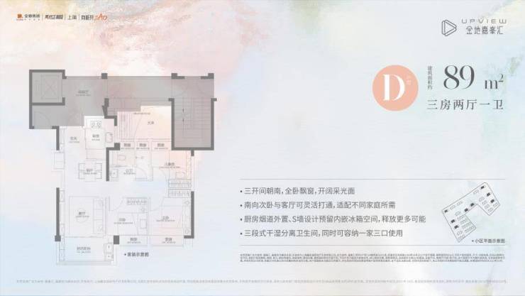 先来看看建面约89㎡三房两厅一卫(D户型),不仅功能完备,而且很好地把控了总价,约350万起即可上车高配品质三房,空间感十足!