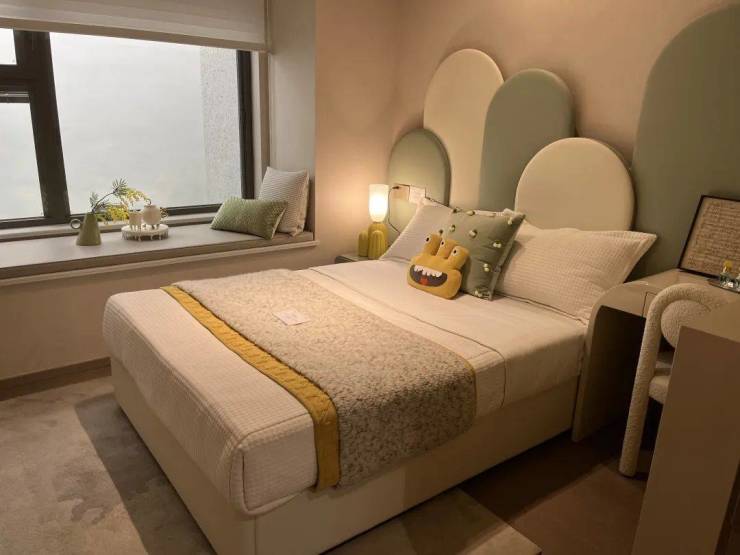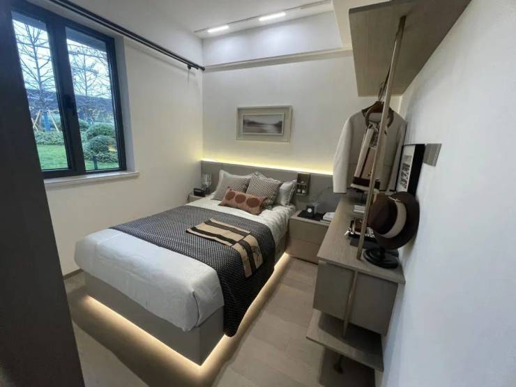 此外,家用床的工厂定制,床架、床帮、床腿等部件,会留出8厘米左右空间,但是在样板房里,一般是做到最紧凑。床头柜有的只放一个,甚至不放。