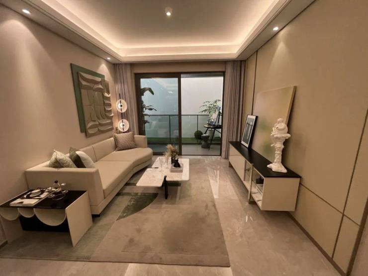 此外,这一房型的客厅也没有做电视柜,取而代之的,是背景墙下挖空一角,辅以灯光提亮。销售人员介绍:“客厅宽3.8米,毕竟面积就在那。样板房就是看一个大概,真正住的话,肯定还要添很多家具。看着没有现在这么宽敞。”