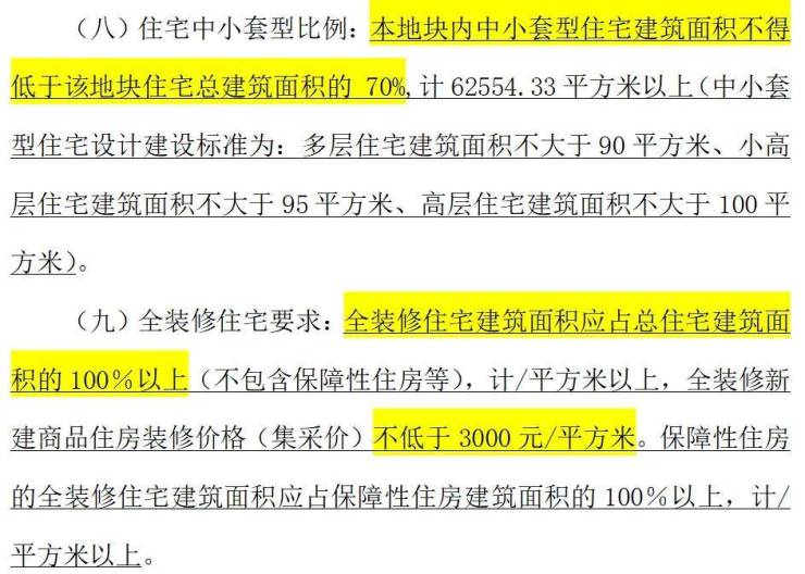 地块指标方面,中小套户型的比例要求不小于70%;100%全装修,装修集采价的标准不低于3000元/平。