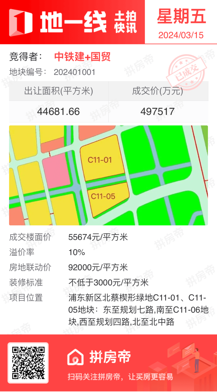 今年3月15日,上海首轮土拍中,中国铁建&国贸联合体竞得浦东新区北蔡楔形绿地C11-01、C11-05地块,联动价9.2万/㎡。