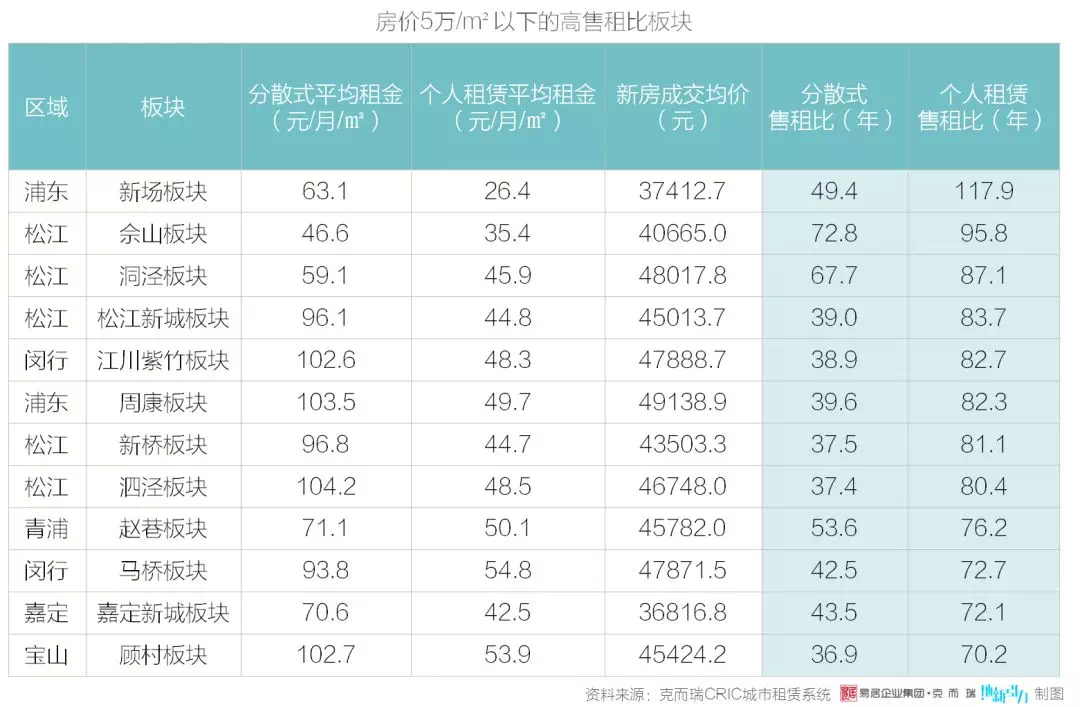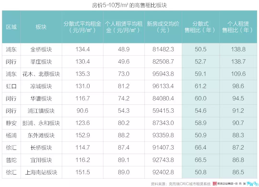 上海新房房价在 5- 10 万/m² 区间的板块共有 36 个,多分布在中外环。同理,界定分散式房源售租比在 50 年以上、个人租赁房源售租比在 85 年以上的区域,筛选出售租比处于前 30% 的 11 个板块,见下表。