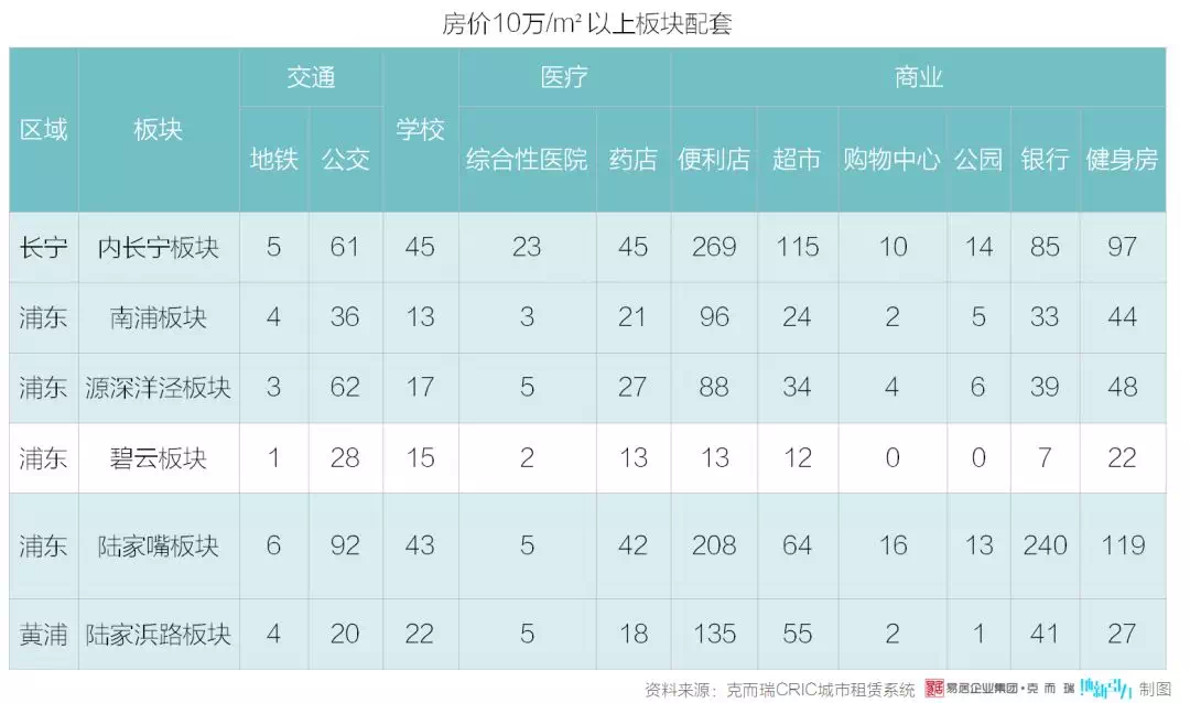 房价 10 万/ m² 以上板块的配套相对完善。其中,碧云是上海老牌的国际社区,但真正意义上的碧云国际社区面积并不大,从整体板块来看,碧云板块虽然自驾便利,但轨道交通薄弱,对于自驾率相对较低的租房人群不太友好,同时区域内商业配套较少。