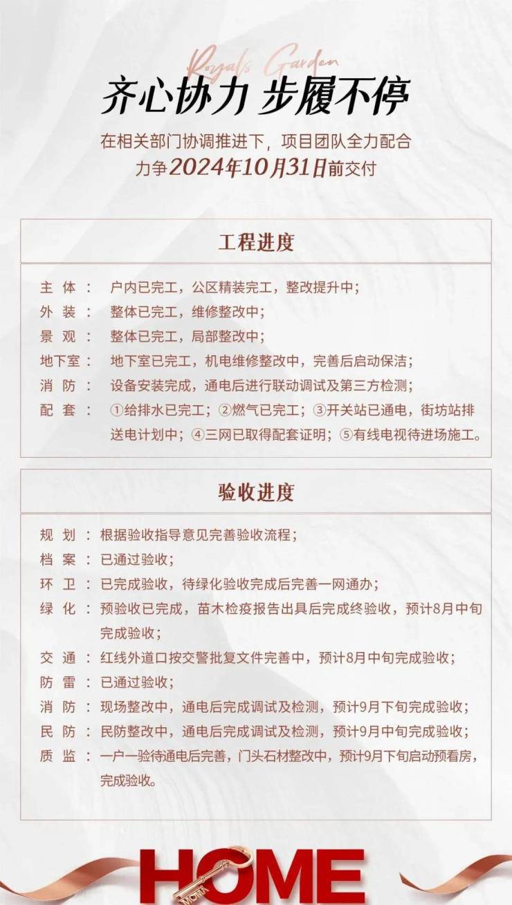 根据君御公馆官方公众号显示,项目前期房源力争2024年10月31日前交付,目前处于验收整改阶段,包括景观、绿化、外装、电力、门头石材等,预计于9月下旬启动预看房。