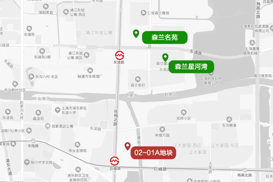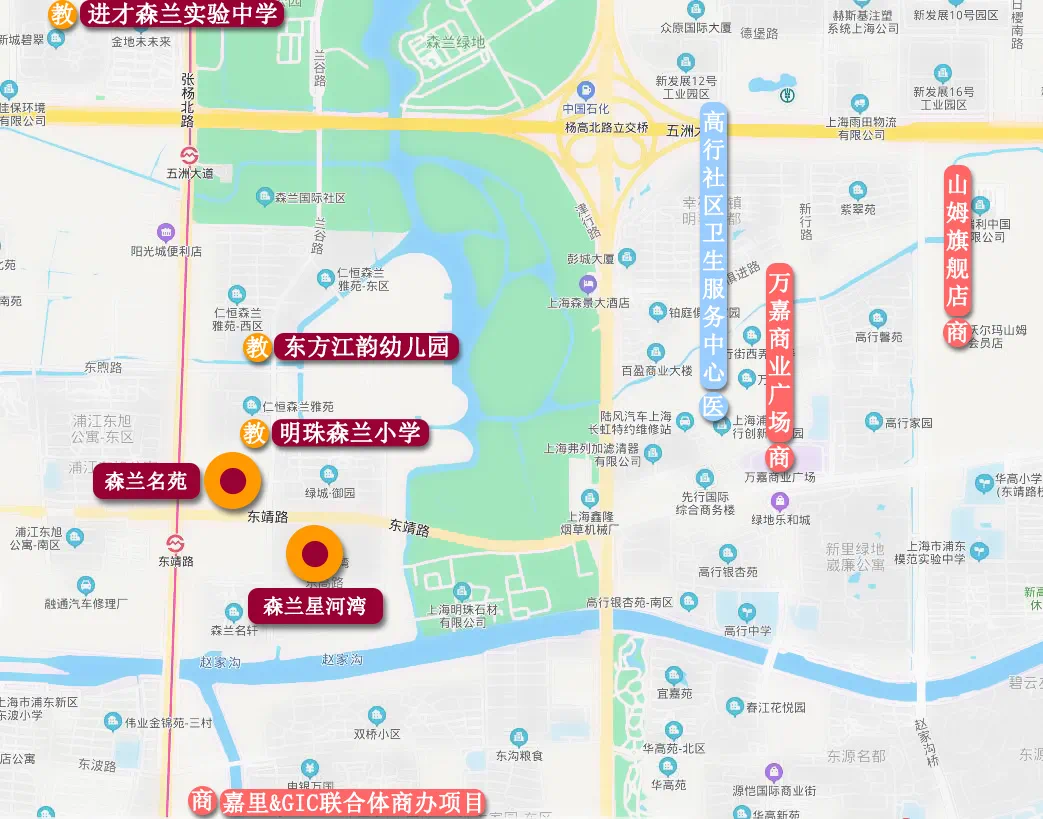 而处于森兰星河湾斜对面,位于东靖路北侧的森兰名苑,距离6号线与周家嘴路-东靖路隧道更近些,直线距离分别为300米与460米。