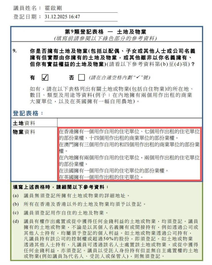根据申报细节,霍启刚名下共有35处物业,其中7处为自用,其余28处用于出租。这些物业遍布中国香港、澳门、内地、法国及英国,具体包括中国香港22处、中国内地4处、中国澳门7处(含4个商业单位),以及法国、英国各1处物业。值得关注的是,此次申报并未包含家族信托部分,仅为其个人直接持有的资产,价值不菲。