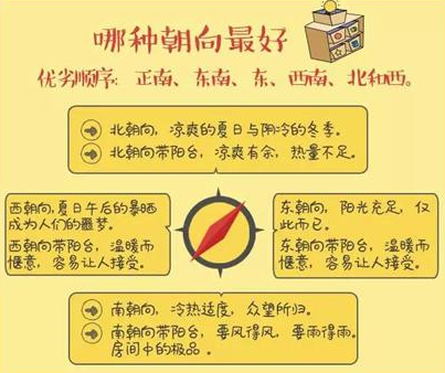 一般来说住宅的朝向优劣顺序为正南、东南、东、西南、北、西。在选择南北向户型时,应该注意房屋的进深不能过大,进深过大,整个户型结构会显狭长型,处于中间的厅室采光会比较弱,不能确保每个房间的采光均衡。