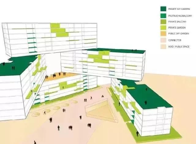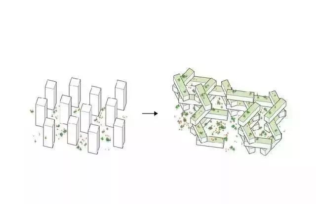 公共外部区域和共享空间交织在一起在成群的塔楼中穿拆错落。