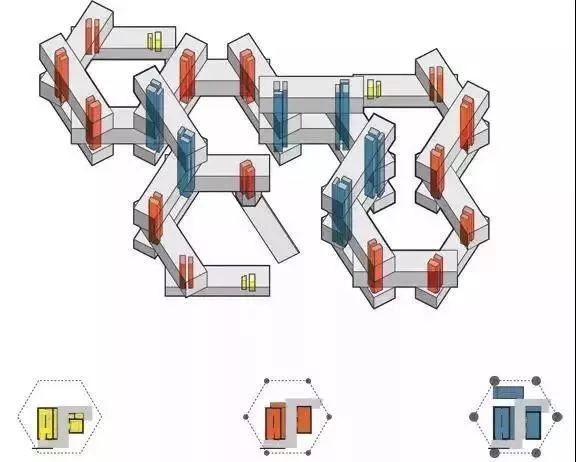 The Interlace(交织大楼)这片住宅区占地约8万平方米,整体成六角形,以横向分开错位的方式叠加,该区共有31栋住宅楼,每栋楼6层高,虽然楼层不高,但经过叠堆后,相当于悬空24层楼,楼与楼中间构成了一个巨大的通透庭院,交织出来的空间也成了空中花园、私人和公共屋顶,以便住户进行娱乐。