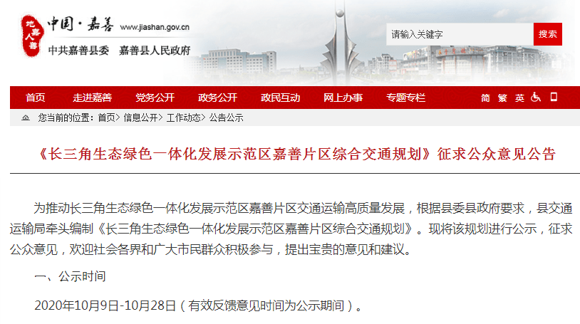 日前,《长三角生态绿色一体化发展示范区嘉善片区综合交通规划》已公示,征求公众意见,时间为2020年10月9日到10月28日。