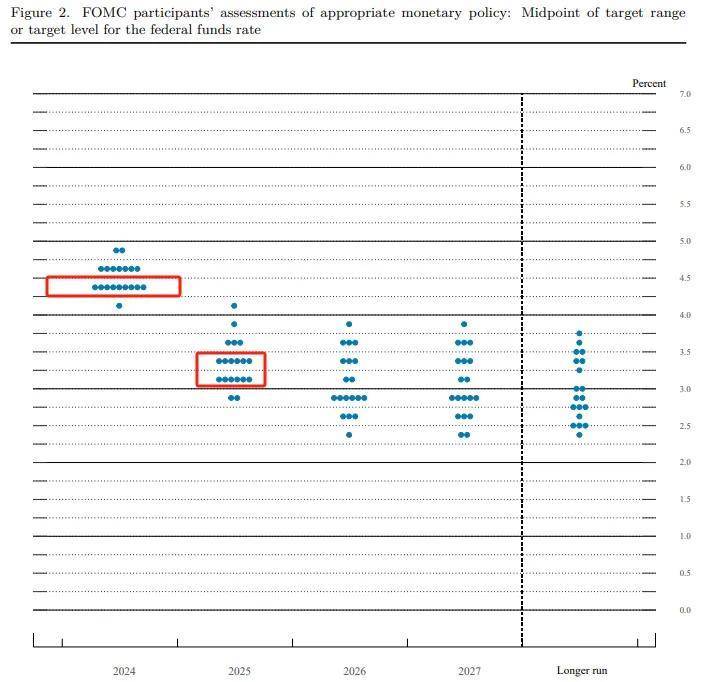 此外,根据美联储的预测,今年年底美国联邦基金利率将达到4.4%,即4.25%至4.5%的目标区间,到2025年将降至3.4%,到2026年预计将降至2.9%。