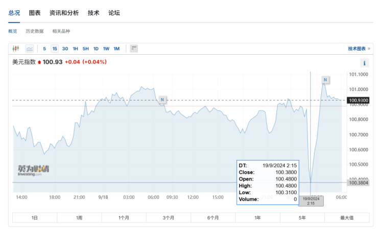 美元指数在宣布降息后一度大幅跳水,最低跌至100.22点,随后迅速拉升,截至发稿涨0.04%。