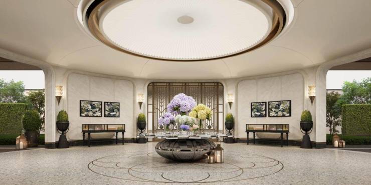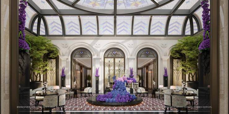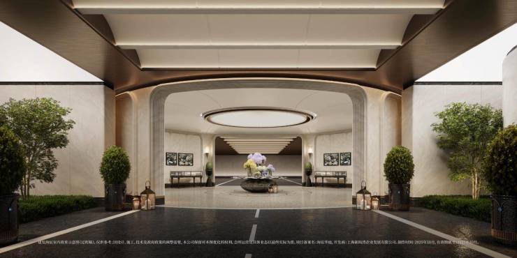 玉兰门庭:取意上海市花白玉兰,勾勒总长约65米、高约13.7米的玉兰门庭:飞翼祥纹铜雕府门镶嵌非遗掐丝珐琅门钹,礼迎璀璨归途;环抱式落客前场移步易景,归家仪式感拉满。
