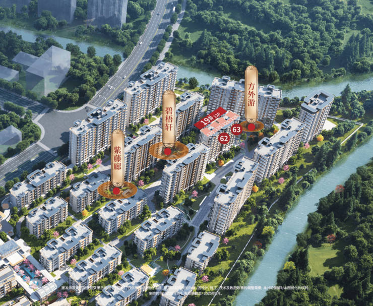 19#园心寰景楼座:12层低密小高层,双单元布局,首层增设架空泛会所,坐落两轴双环八景五园之心,内环景观步道三面环绕,南邻“方外游”,北接“碧梧轩”。